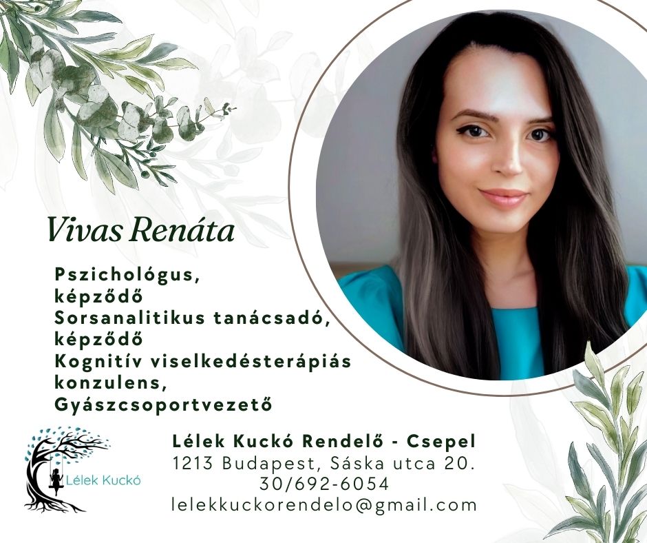 A közös munka alapja a támogató, empatikus párbeszéd. Módszereim között szerepel a kognitív viselkedésterápia (CBT), mindfulness és relaxációs technikák, imaginációs gyakorlatok, a Szondi-féle sorsanalitikus tanácsadás, valamint a pozitív pszichológia szemlélete. Időszakosan gyászcsoportokat is vezetek. Várlak szeretettel!”